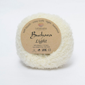 Пряжа Lanamania Buchara Light - нежная, теплая и при этом удивительно легкая. Для создания этой пряжи используется шерсть бэби альпаки, которая крепится на тончайшую нейлоновую нить, покрытую шерстью. Из пряжи Lanamania Buchara Light прекрасно получатся изделия, которые будут выглядеть как цельное полотно и на нем не будет заметно петель. Структура пряжи придает изделиям дополнительный объем, мягкость и пушистость.